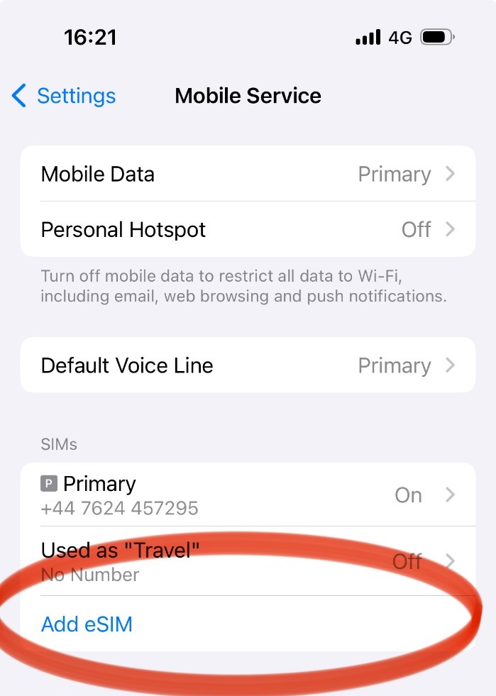 1. First, go to the Settings screen of your iPhone. From there, tap on “Mobile Service”. There, tap the “Add eSIM” to go to the Set Up screen.