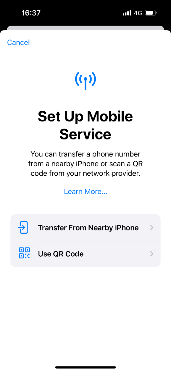 2. Once you are on the Set Up eSIM screen, tap on “Use QR Code”. Then, you will be taken to the scanning screen. Here, scan the QR code that is provided to you by the eSIM service.